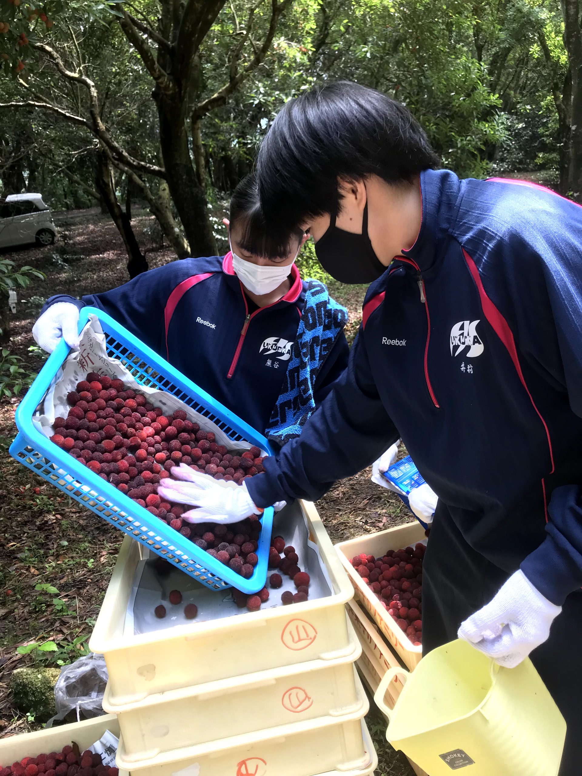 ・6月15日~12日間にわたり、那珂川市や商工会等の協力も得て、那珂川市だけでなく福岡県内の多くの市民ボランティアに参加してもらい(延べ260名)、やまももの実の収穫作業を行いました。今年度は、例年以上にやまももが豊作で、また福岡女子商業高校他のボランティアさんの参加も多かったことから目標の1トンのやまももを収穫することができました。