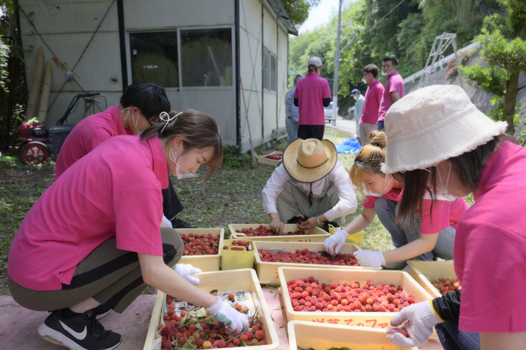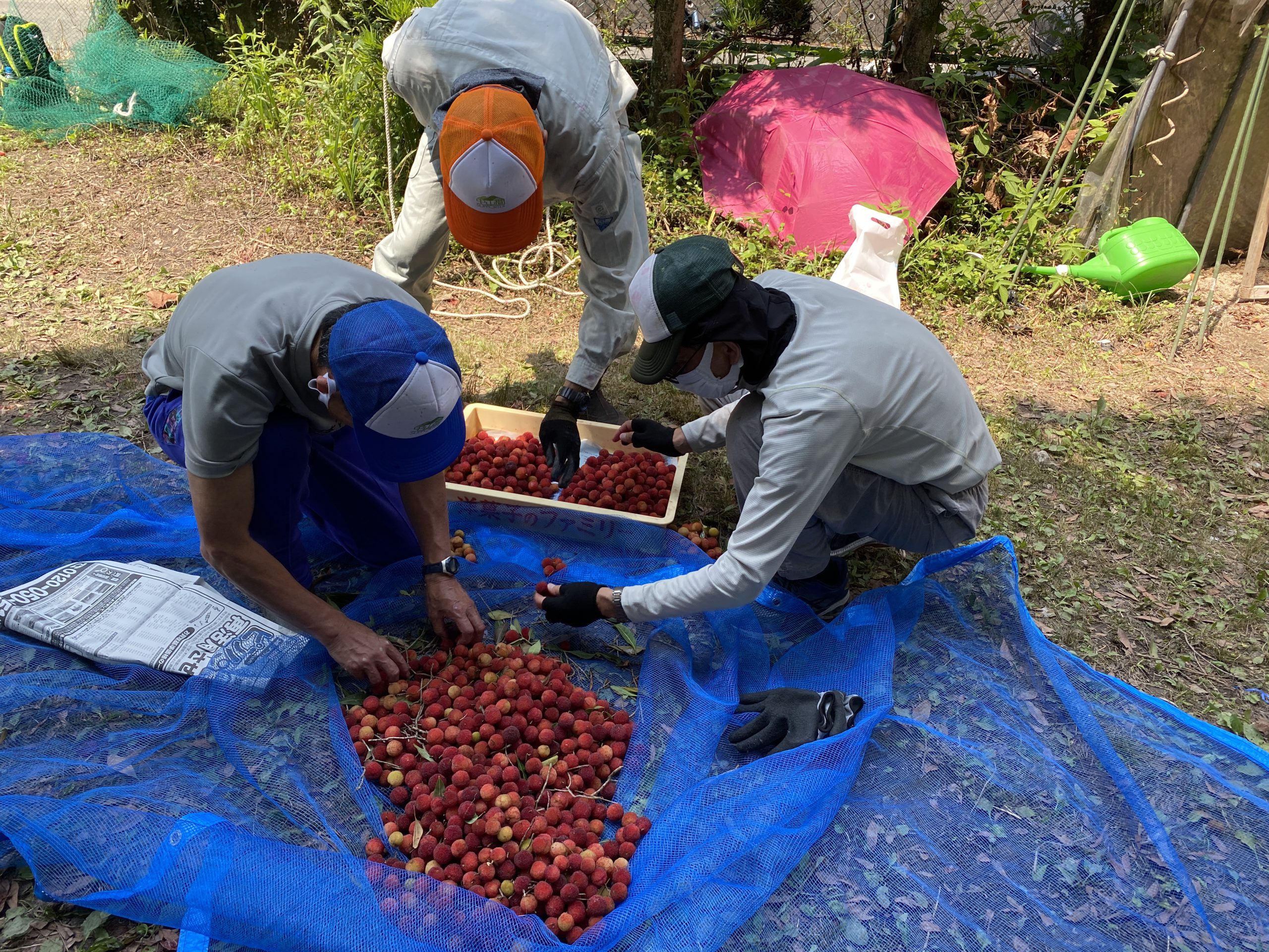 ・㈱愛しとーとの社員や福岡女子商業高校の生徒さんの他に那珂川市や福岡県の協力も得て、那珂川市だけでなく福岡県内の多くの市民ボランティアに参加して頂き、やまももの実の収穫作業及び洗浄作業を行いました。収穫作業は6月15日から7月1日まで、参加者数は延べ120人。