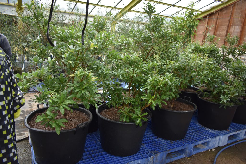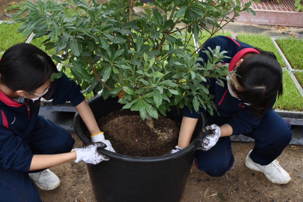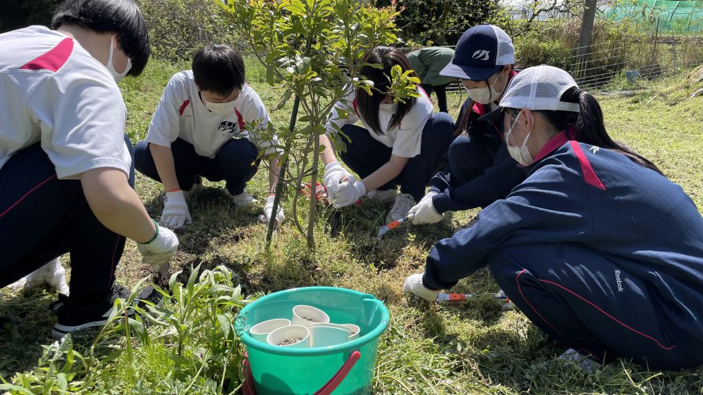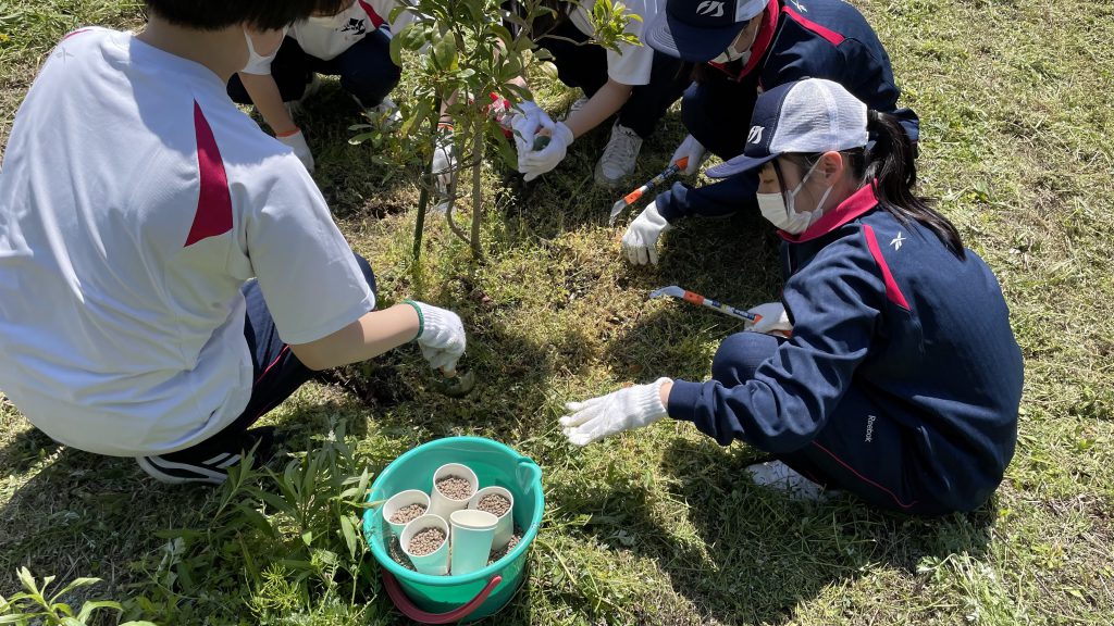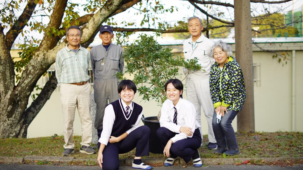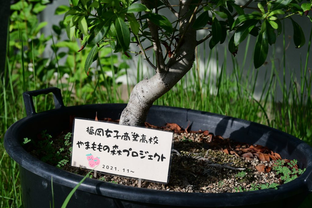 ・講師指導のもと低木の鉢植え10本での栽培に挑戦し、福岡女子商業高校の校庭に鉢植えの苗木を移植し、高校生の手で水やりなどをして育ててもらっています。